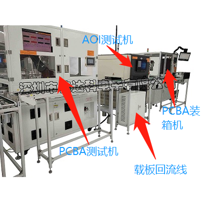 PCBA自动测试线体是由一台PCBA测试机,一台AOI测试机,一台PCBA分拣装箱机,一台测试载板回流线体组成(上图所示);
