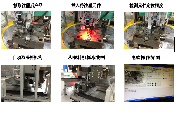该设备为客户专门开发的,应用于立式注塑机的一体化自动设备,其可与注塑机控制联动,对于注塑机填料工作:可实现自动送料;自动抓料;自动填料;自动检测的连续动作;在注塑机完成注塑后,该设备将自动完成取料,分料等工作,整个生产过程实现完全无人化,生产过程完全自动化。 该设备自动化程度高,具有多轴,多方向,多角度运行功能。采用多路气动及伺服驱动,CCD光学定位,PC控制系统,填装料定位及检测精度可以达到±0.01mm,运行稳定可靠,速度快,可为客户成倍提高生产效率,节约人工成本。